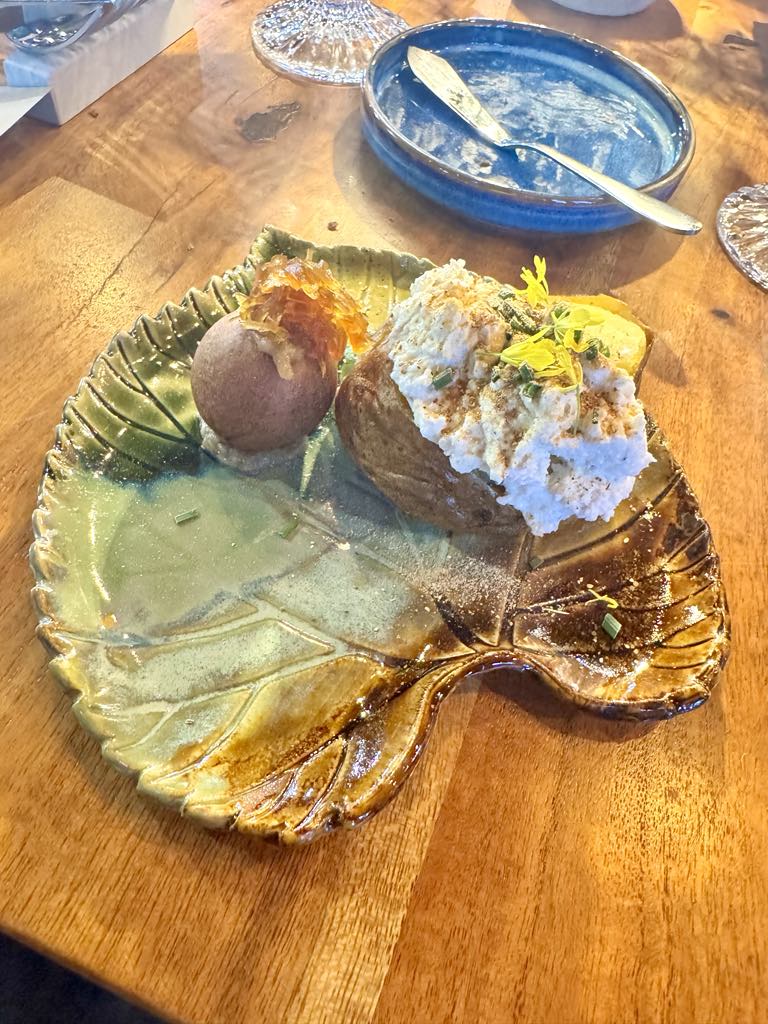„Pyra z sabatnika” – to ziemniak podany z gzikiem, ketoszanką, młodą cebulką, gryką oraz kandyzowaną kiszoną kapustą, serwowane na talerzach w kształcie liścia lipy – symbolu Potaśni. To była interpretacja prostoty, która zachwyca.