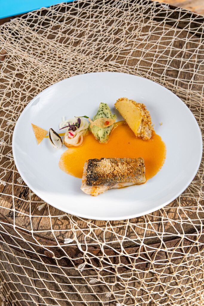 z potrawą: Rolada z karpia/Sos berneński/Dynia/Imbir/Limonka/ Ciasto cygaretkowe/Warzywa sous-vide/Oliwa miętowa