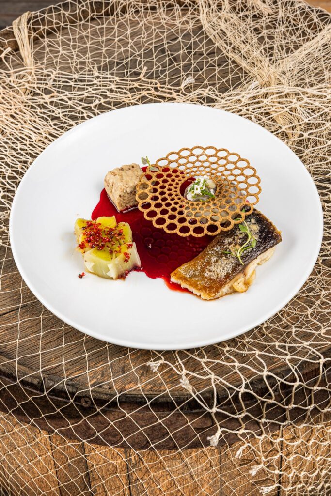 z potrawą: Filet z karpia konfitowany w maśle palonym/ Emulsja z koperku/ Purée z pieczonego pasternaku/ Sos Rieslingow