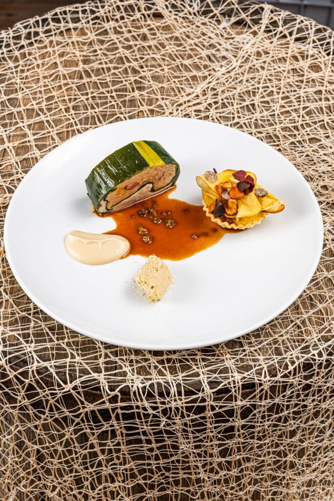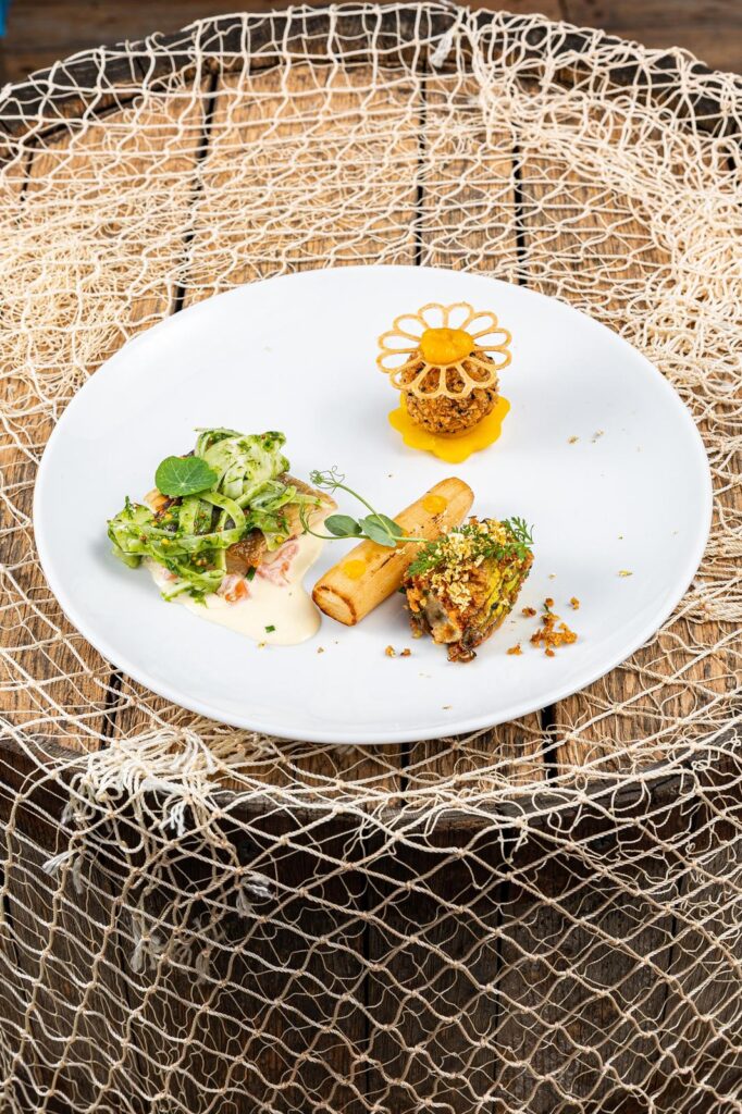 z potrawą: Rolada z karpia/Sos berneński/Dynia/Imbir/Limonka/ Ciasto cygaretkowe/Warzywa sous-vide/Oliwa miętowa