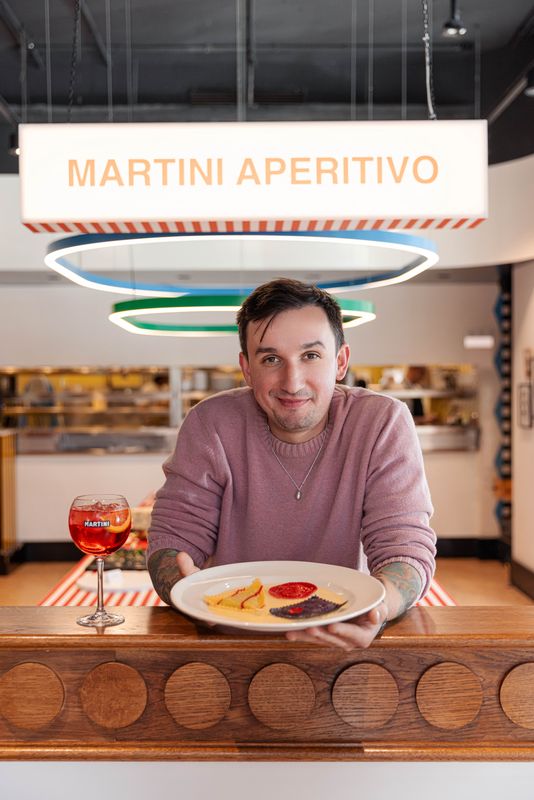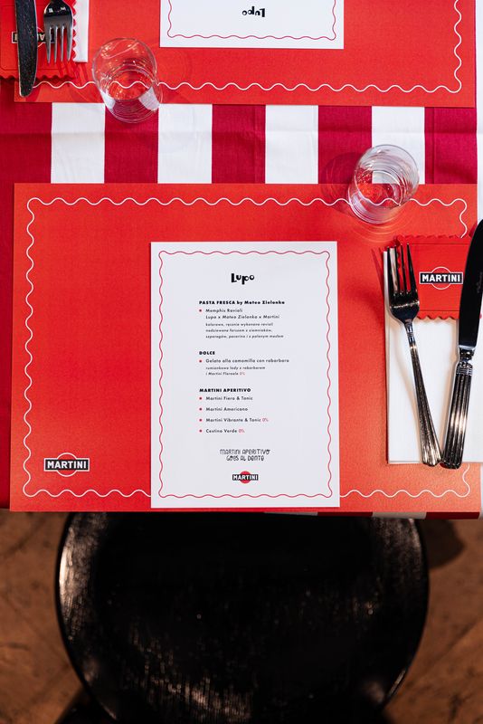 Przepis, który stworzył Mateo, inspirowany jest niewymuszonym stylem, lekkością i klasą włoskiego brandu. „Martini to ikona – elegancka, z wyjątkowym designem. Moja pasta odzwierciedla te cechy” – zdradza. Tak właśnie powstało ravioli z ziemniakami i wiosennymi szparagami w maślanym sosie. Makaron zachwyca geometrycznymi formami, a w jego kompozycji nie zabrakło akcentu kolorystycznego w postaci charakterystycznej czerwieni Martini.