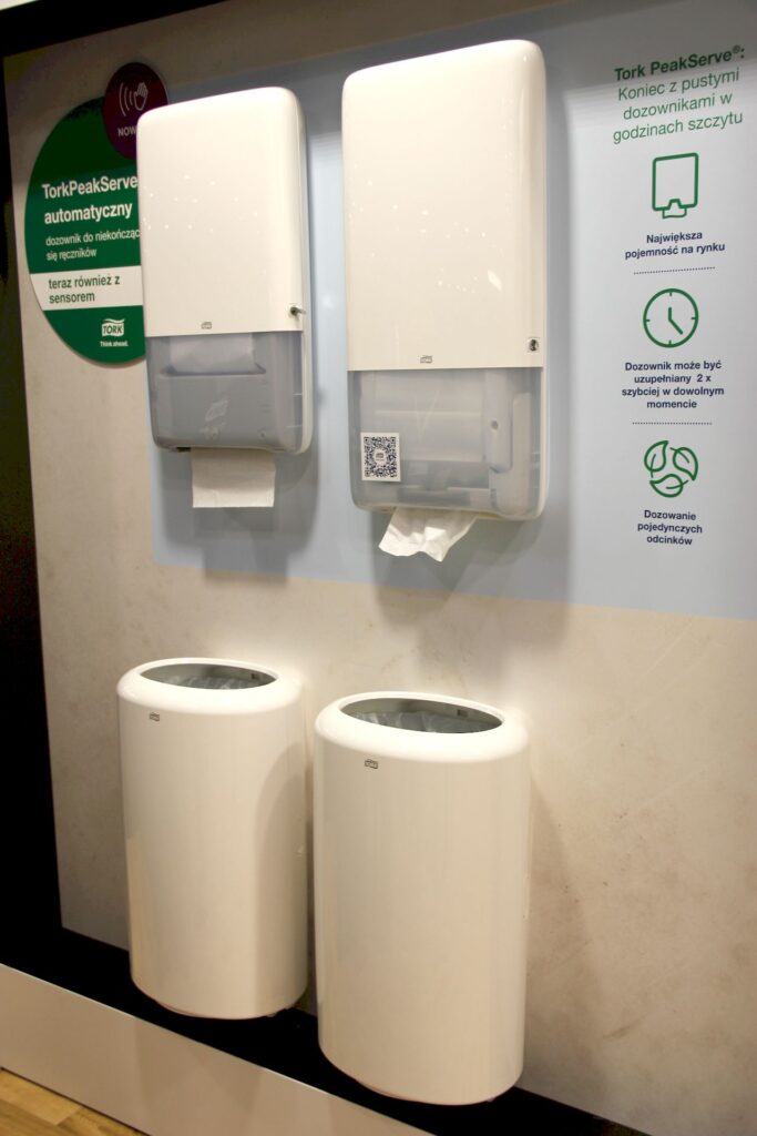 Kolejnym prezentowanym rozwiązaniem był dozownik Tork PeakServe®, przeznaczony do toalet o dużym natężeniu ruchu”. Jest to system o charakterze hybrydowym, łączący zalety ręcznika w roli z funkcjonalnością tradycyjnych ręczników składanych typu „zrywka”. W jednym dozowniku mieści się około 1230 odcinków papieru, co znacząco zwiększa wydajność i ogranicza konieczność uzupełniania. System dozowania pojedynczego odcinka wpływa na ograniczenie zużycia oraz poprawę higieny użytkowania.