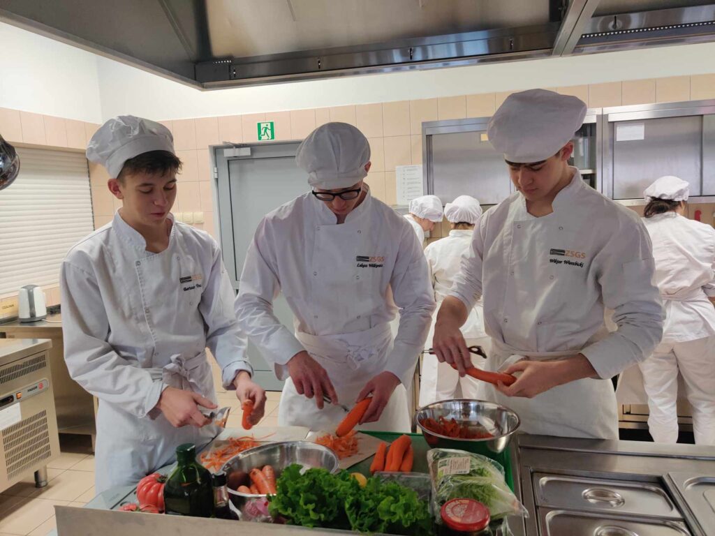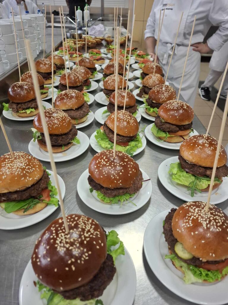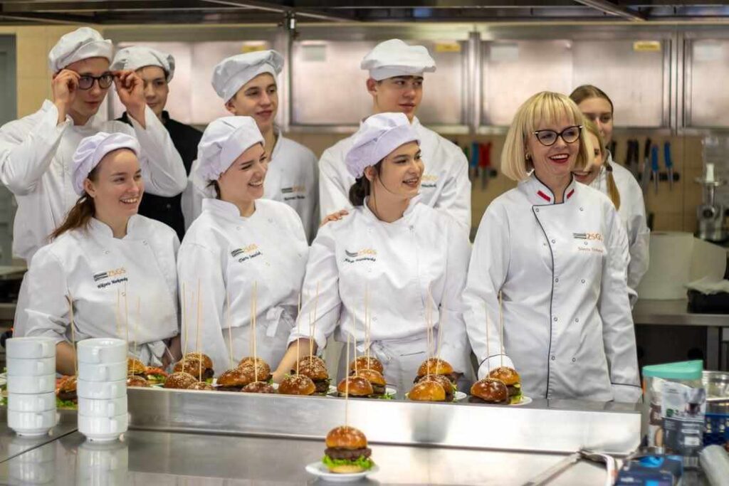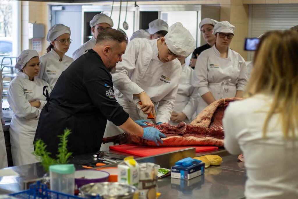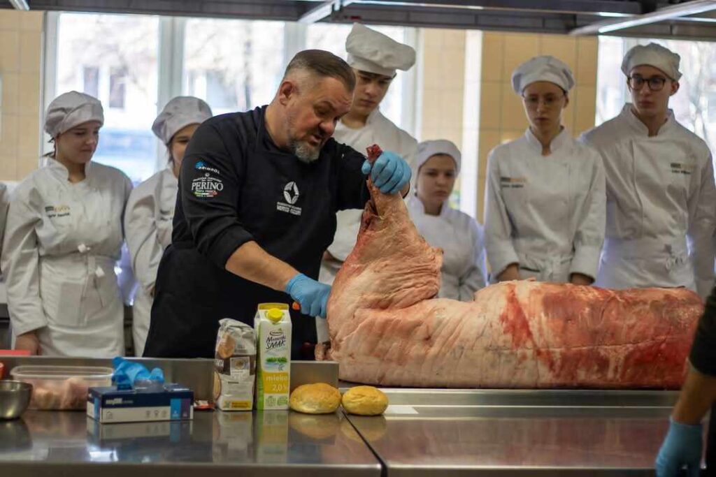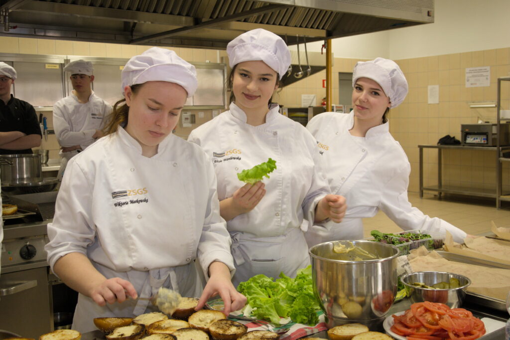 Następnie głos zabrała Pani Dorota Michalak, która przywitała uczniów oraz przedstawiła walory odżywcze dziczyzny. Pani Wioletta Róża Rutkowska, Dyrektor Szkoły, również zabrała głos, dziękując za przybycie i zorganizowanie warsztatów kulinarnych dla młodzieży. Po przemówieniach do działania wkroczył szef kuchni, Pan Jakub Wolski, który rozpoczął warsztaty od fachowego podziału tuszki dzika, bohatera dzisiejszych warsztatów. Zachęcił uczniów do spróbowania swoich sił w rozbiorze na elementy kulinarne pod jego fachowym okiem. Następnie uczniowie przystąpili do sporządzania soczystych burgerów z dzika z aromatycznym majonezem jałowcowym, genialnego dzikiego gulaszu oraz wyśmienitego pasztetu z dzika. Pod czujnym okiem szefa kuchni, Pana Jakuba Wolskiego, młodzież z zaangażowaniem i entuzjazmem wykonywała kolejne etapy przygotowywania potraw.