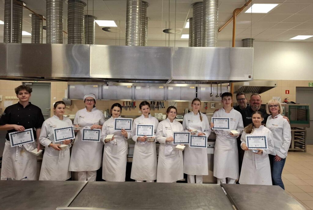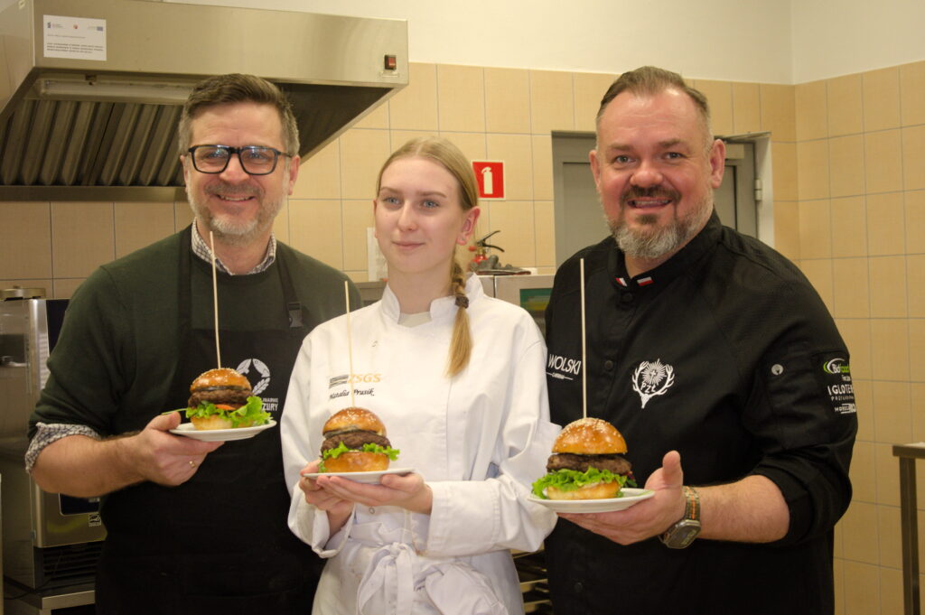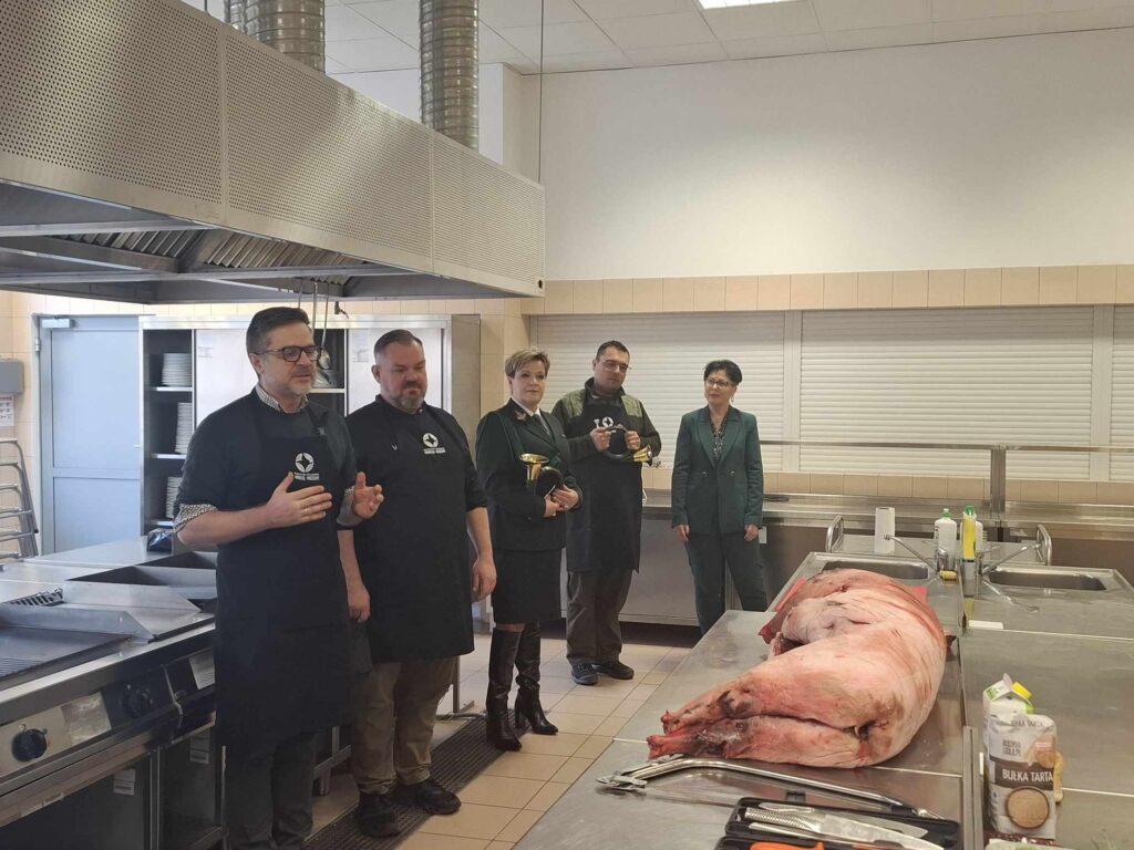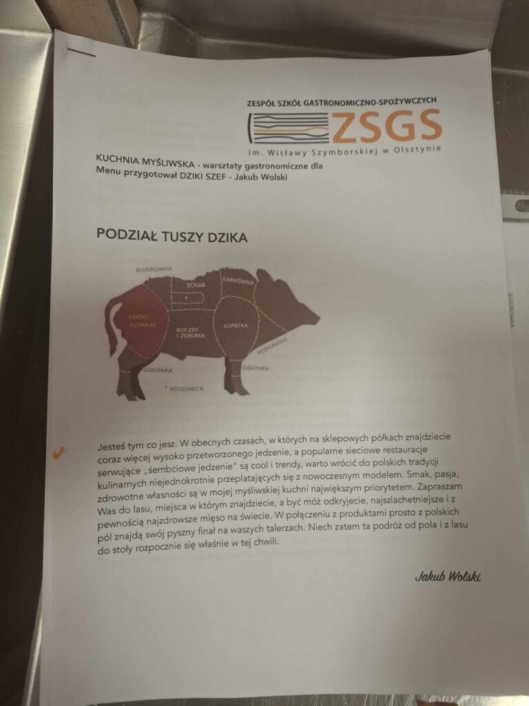 Szef kuchni był pod wrażeniem ich pracy, doceniając zarówno ich ogromne zaangażowanie, jak i duże umiejętności praktyczne. Na koniec warsztatów wszyscy uczestnicy otrzymali pamiątkowe dyplomy oraz własnoręcznie przygotowany i pięknie zapakowany pasztet z dzika. Całe wydarzenie było niecodzienną okazją do promowania regionalnych tradycji kulinarnych, połączonych z edukacją i praktycznym doświadczeniem. Uczniowie mieli możliwość nie tylko nauczyć się nowych technik kulinarnych, ale także poznać walory odżywcze dziczyzny oraz znaczenie kuchni myśliwskiej w tradycji Warmii i Mazur. Koordynatorami warsztatów kulinarnych byli Pan Paweł Błażewicz, Przewodniczący Komisji ds. Promocji Dziczyzny Zarządu Okręgowego PZŁ w Olsztynie, oraz Pani Jolanta Urbanek, Wicedyrektor Zespołu Szkół Gastronomiczno-Spożywczych im. Wisławy Szymborskiej w Olsztynie. Dzięki ich zaangażowaniu, warsztaty okazały się wielkim sukcesem, a uczestnicy z pewnością na długo zapamiętają to wyjątkowe doświadczenie.